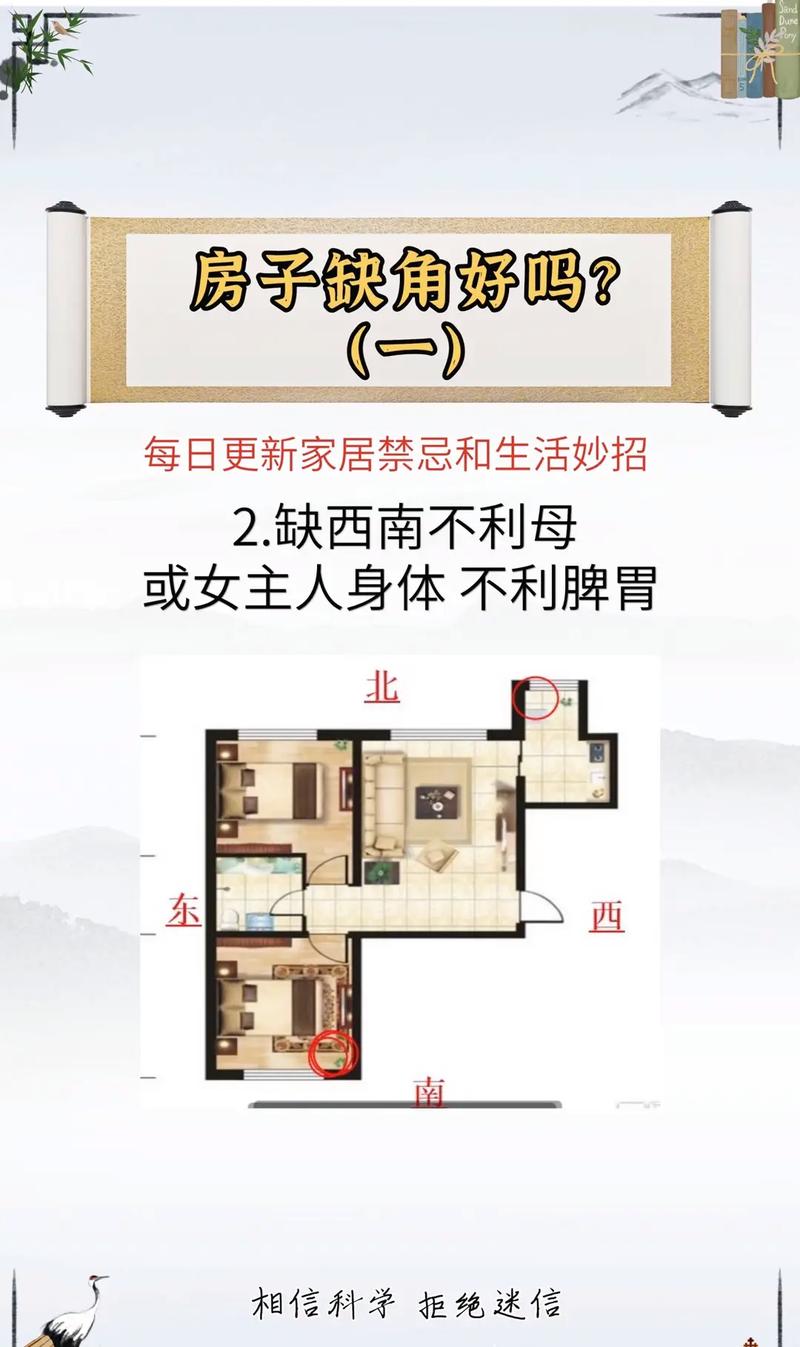 除了臥室、客廳和廚房,房屋的其他區(qū)域也需要注意風(fēng)水布局。例如,房屋的缺角會對居住者的運勢產(chǎn)生不利影響。若房屋缺西北角,容易導(dǎo)致男主人事業(yè)不順,影響夫妻關(guān)系。若房屋缺西南角,容易導(dǎo)致女主人身體不好,影響家庭和諧。