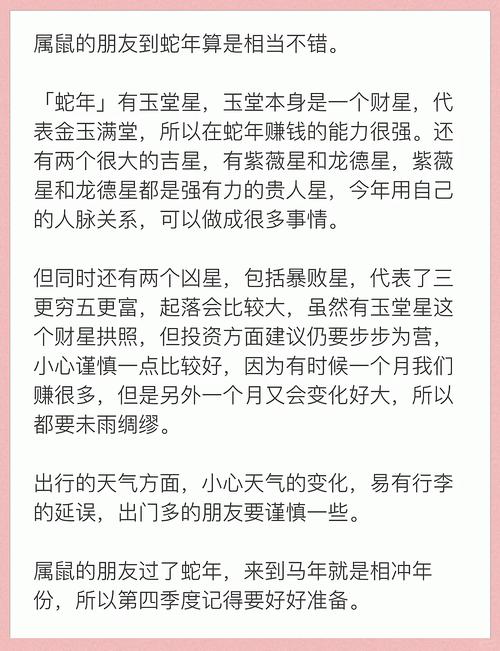 2025年是屬蛇之人的本命年,謂之“值太歲”,運勢起伏較大,宜低調(diào)謹慎。事業(yè)方面,可能會遇到一些變動,需保持冷靜,積極應(yīng)對。財運方面,支出增多,收入不穩(wěn)定,需做好財務(wù)規(guī)劃,避免過度消費。感情方面,容易因小事發(fā)生爭執(zhí),需加強溝通,互相理解。健康方面,注意身體健康,避免過度勞累。本命年宜佩戴一些化太歲的飾品,以求平安順利。如果八字中火旺,則太歲的影響會更大,需格外小心;反之,如果金水旺盛,則能化解部分太歲之力。