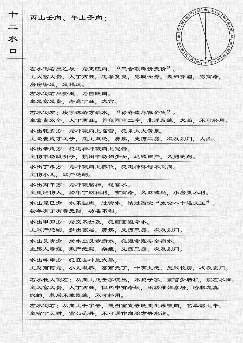 19. 丙山壬向:丙山壬向宜庚酉方水口,主事業(yè)亨通,名利雙收;忌癸丑方水口,主血光之災(zāi),官司纏身。
