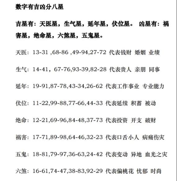 3. 數字的組合與磁場:在數字風水學中,數字的組合會產生不同的磁場,這些磁場對應著吉兇。例如,某些數字組合被認為是吉星,如13、68等,而另一些則被認為是兇星,如12、69等。通過分析數字的組合,可以判斷其吉兇。