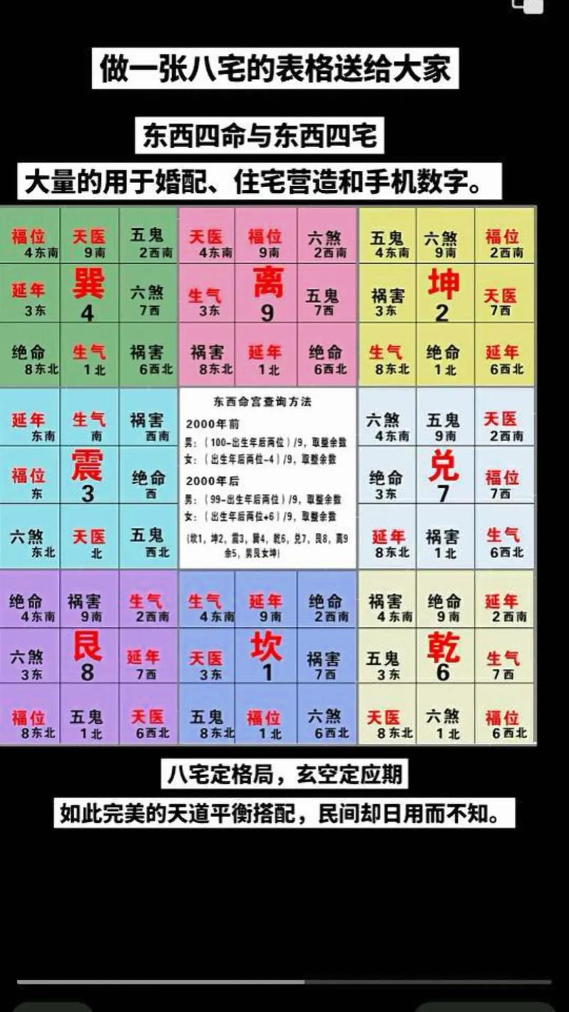 3. 計算命卦:根據(jù)出生年份,使用特定公式計算個人的命卦,確定是東四命還是西四命。