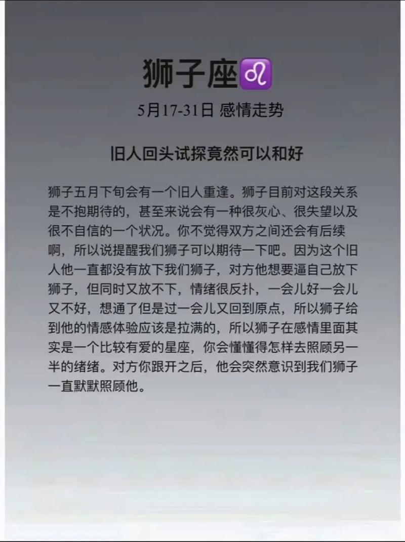 內(nèi)心的矛盾:獅子座在5月下旬可能會更加明確自己的感情需求,但仍會感到糾結(jié)和迷茫。盡管獅子座在感情中表現(xiàn)出強烈的自信和熱情,但在面對舊愛時,他們?nèi)孕枰鉀Q內(nèi)心的矛盾和不安。
