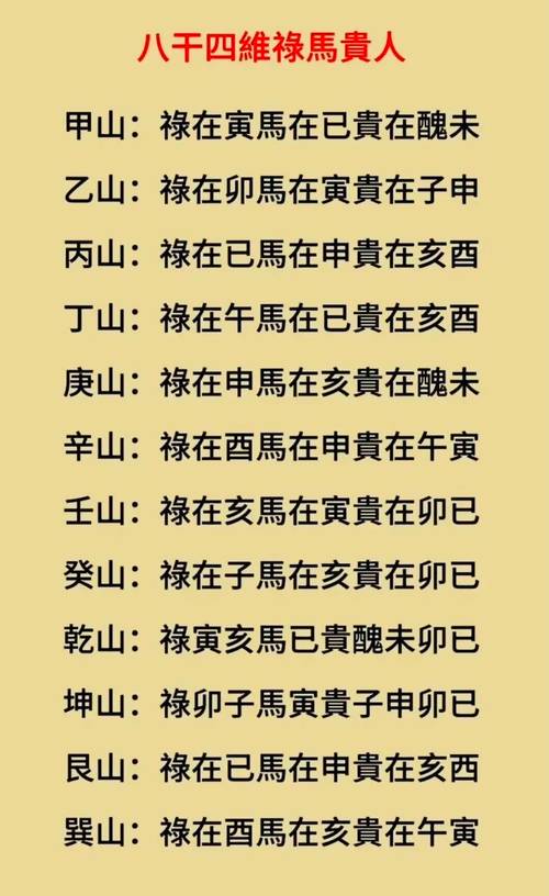 貴人方位:每個(gè)山向都有對(duì)應(yīng)的貴人方位,如甲山以丑位為貴人,乙山以子位為貴人等。