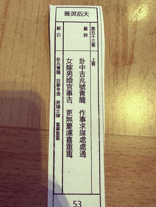 媽祖靈簽第五十五簽,簽文為:“‘掌上明珠渾似月,高樓嬌女宛如花,有緣相逢成兩姓,望重家門更顯華’。”此簽詩說明,有緣人將遇到貴人,逢兇化吉。