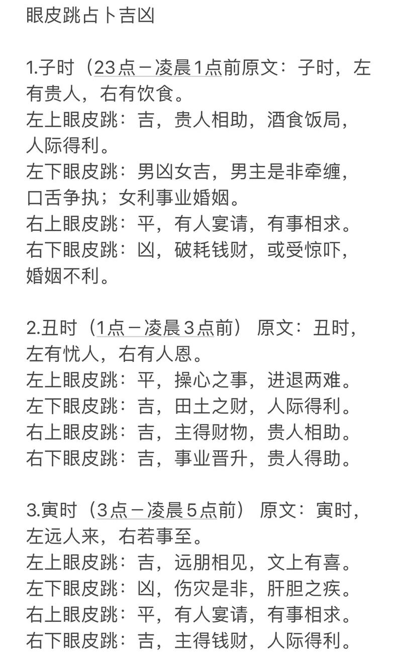 眼皮跳的吉兇說法僅供參考,不可全信。影響眼皮跳的因素有很多,如疲勞、睡眠不足、用眼過度等,不一定是吉兇預兆。