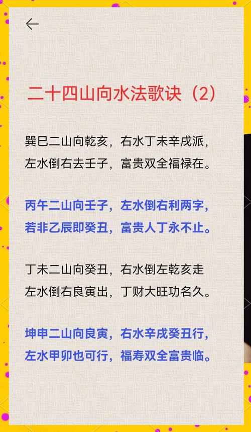 3. 結(jié)合山向與水口:根據(jù)二十四山的方位,結(jié)合水口的方向,判斷吉兇。例如,壬山丙向、子山午向等,每個山向都有特定的水口吉兇判斷方法。