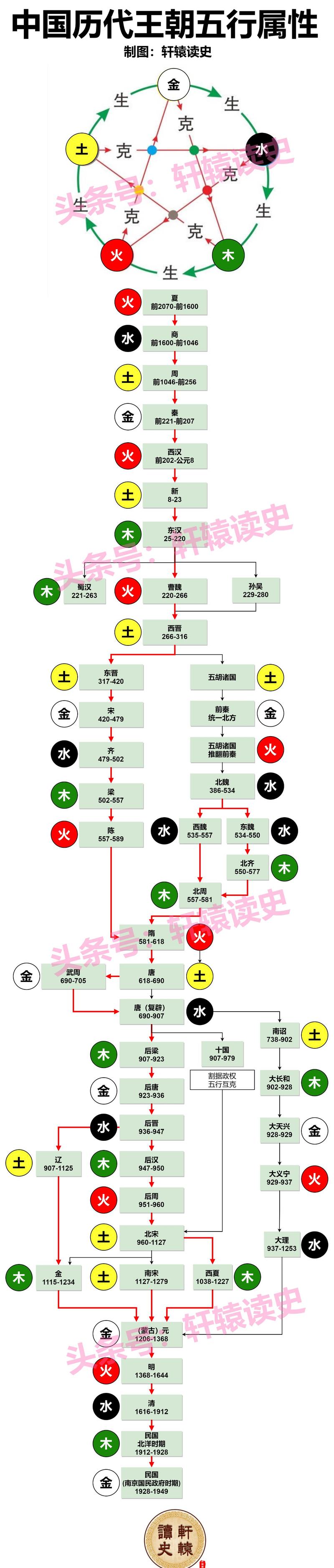 歷朝歷代的興衰更迭,被古人為五行相生相克的規(guī)律。五行相生指木生火、火生土、土生金、金生水、水木相生;而相克則為木克土、土克水、水克火、火克金、金克木。