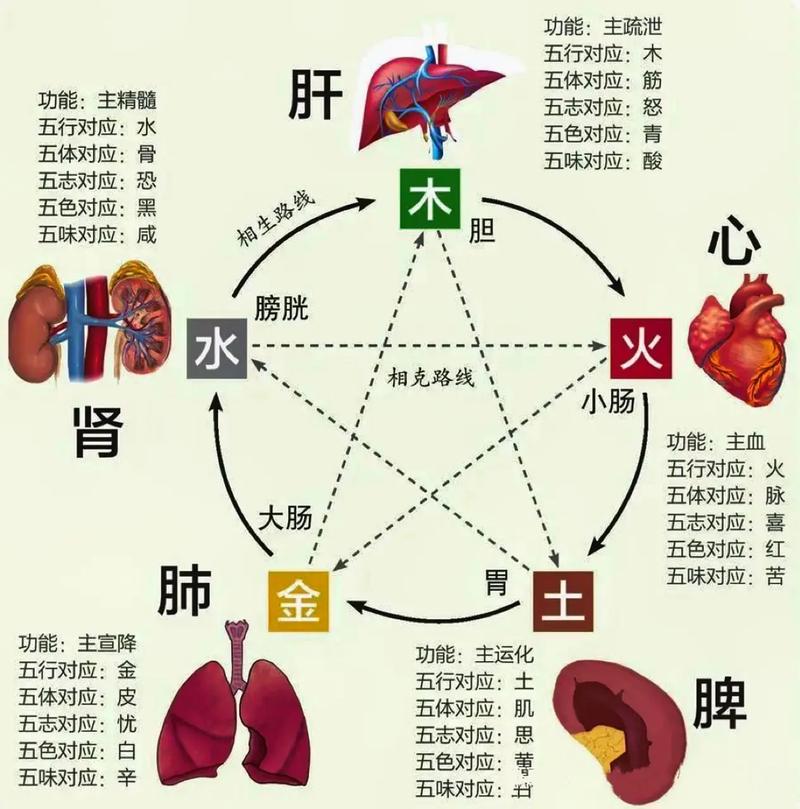 例如,肝屬木,腎屬水。木生火,表明肝臟健康有助于心臟功能;水克火,表明腎臟功能失常會影響心臟健康。