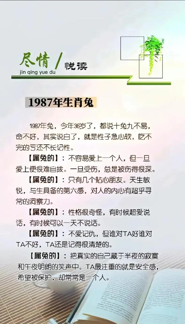 需要注意的是,這只是基于生肖屬相傳統(tǒng)性格特點(diǎn)的一種普遍分析,不能完全代表每一個(gè)1987年屬兔女人的實(shí)際感情態(tài)度,個(gè)體之間仍然存在很大的差異。
