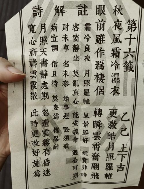 5. 處理簽詩:求簽結(jié)束后,您可以選擇將吉簽隨身攜帶,以備后用。如果求到的是下下簽,建議不要將簽詩帶出寺廟,而是祈求神明幫助化解。您可以向神明拜謝,并將簽詩放回原處,或者將其包在錢中放入功德箱,或者用壽金將兇簽夾住。