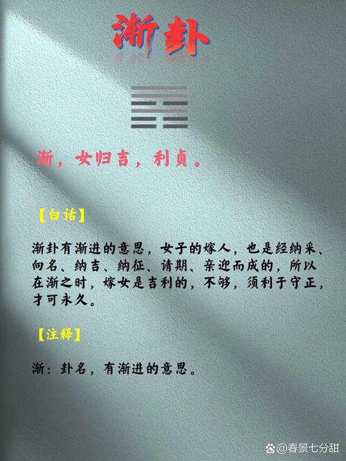 在《易經(jīng)》六十四卦中,漸卦象征著循序漸進(jìn)、逐步發(fā)展。卦辭解釋為:“漸,進(jìn)也?!保庵溉f物循序漸進(jìn),逐步發(fā)展。第三爻爻辭為:“進(jìn)得位,往吉,無不利?!保鞘裁匆馑寄??