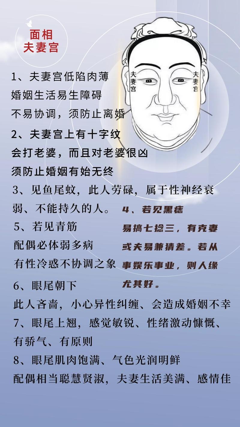 面相學(xué)可以通過觀察面部的特定部位來推測(cè)家居風(fēng)水的好壞。例如,夫妻宮(眼尾部位)的光滑與否、是否有痣或疤痕等,都能反映婚姻和感情的狀態(tài)。
