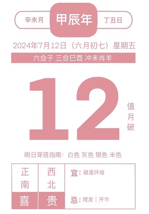 根據(jù)現(xiàn)代黃歷,2024年陰歷六月初七并不是黃道吉日,而是破日,不宜辦一切喜兇事。