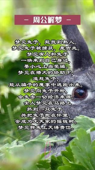 在周公解夢(mèng)中,夢(mèng)見(jiàn)兔肉往往預(yù)示著不同的寓意,具體含義取決于兔肉的狀態(tài)和夢(mèng)境情境。