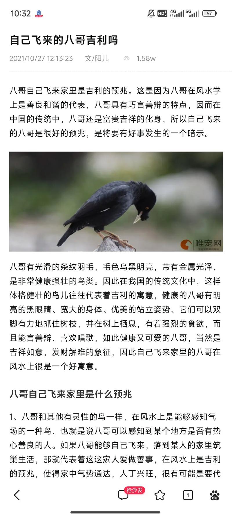 在一些農(nóng)村地區(qū),人們還認為八哥飛進家與家中的運氣有關(guān)。如果八哥在進入家中后落在了吉利的地方,如玄關(guān)、客廳或臥室,則被認為是給家里帶來了好運。相反,如果八哥落在了不吉利的地方,如廚房、廁所或雜物間,則被認為是給家里帶來了厄運。