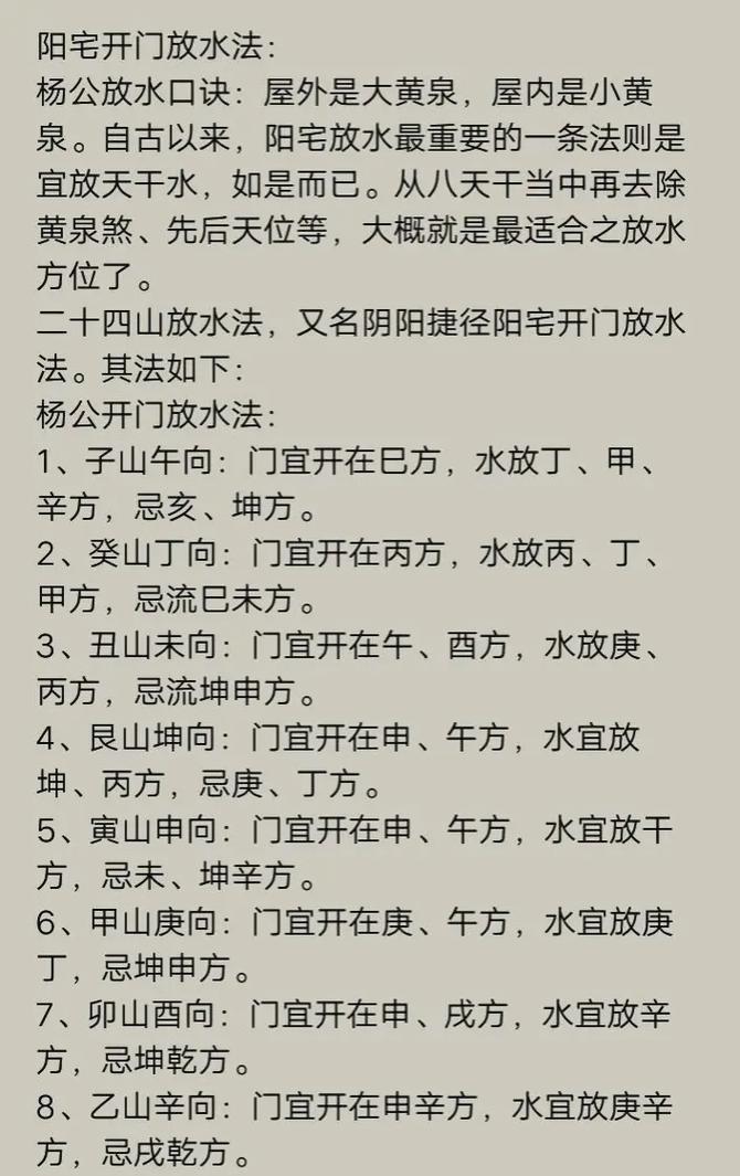 吉水:水應(yīng)從宅院的左側(cè)(青龍方)流入,右側(cè)(白虎方)流出,形成“青龍抱白虎”的格局,有利于財運和人丁興旺。