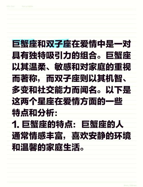 雙子座女生和巨蟹男的性格差異很大,雙子座善于表達,而巨蟹男比較內斂。雙子座喜歡新鮮事物,而巨蟹男更喜歡穩(wěn)定。雙子座女生會喜歡巨蟹男嗎?