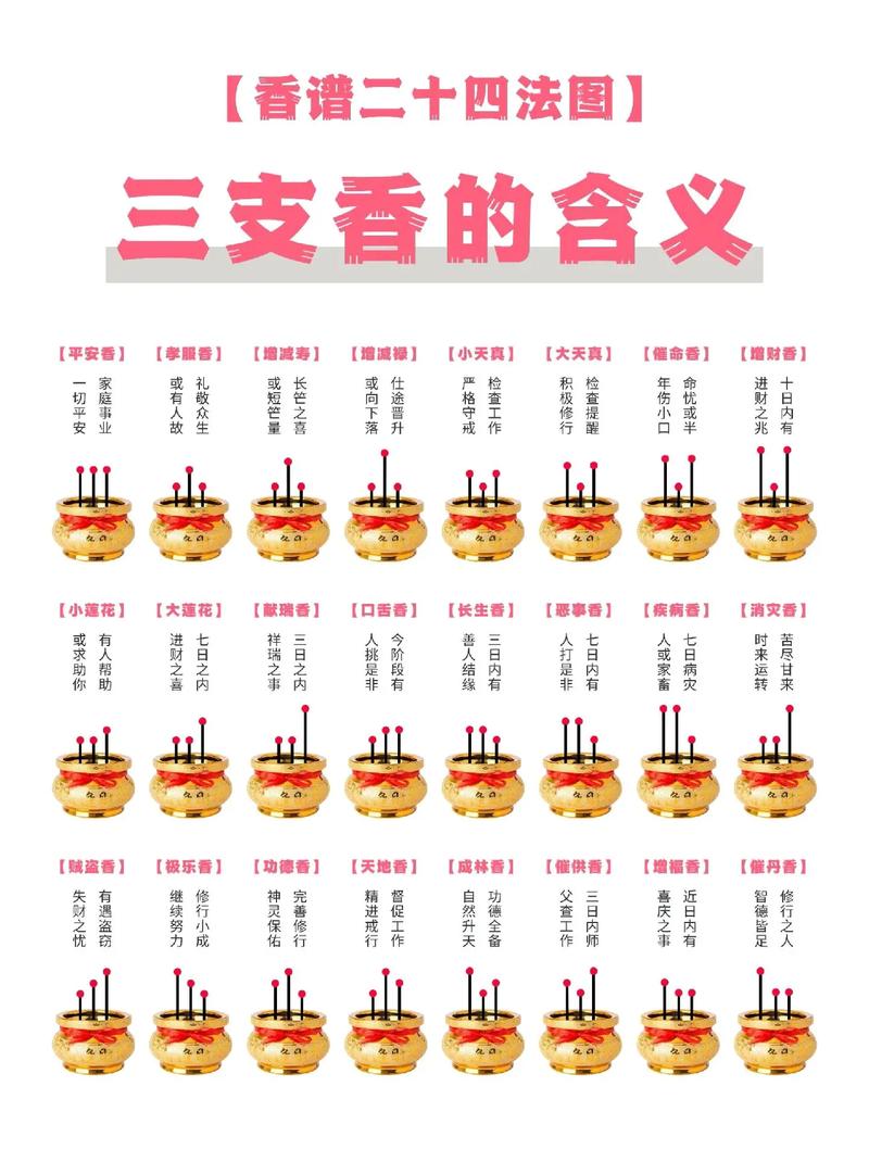 宗教意義:在佛教和道教中,三支香象征著對(duì)“三寶”的敬仰,即佛、法、僧,代表了對(duì)宗教信仰的虔誠(chéng)和尊敬。