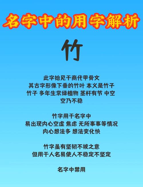 與先祖重名:竹字取名時(shí)應(yīng)該避免與先祖長輩使用相同的字,如果家里先祖輩名字中帶有竹字,晚輩一般都需要避諱用竹字取名。