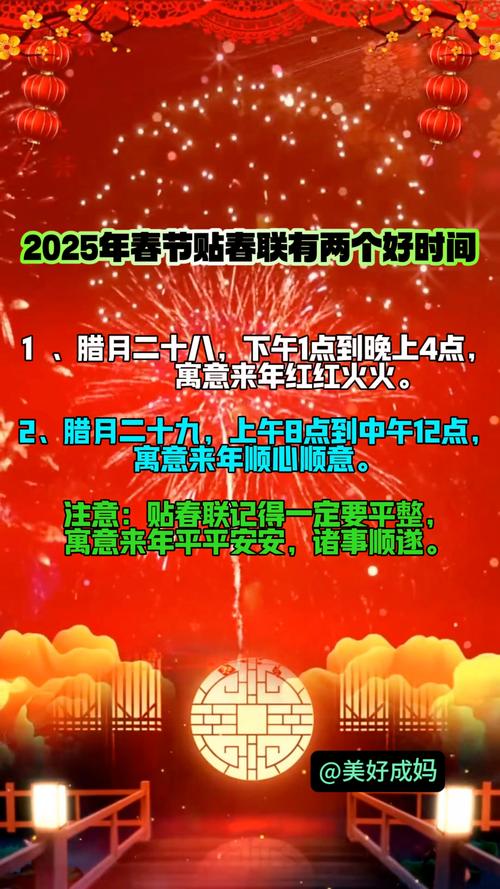 2025年貼春聯(lián)的最佳時(shí)間和吉時(shí)主要根據(jù)中國(guó)傳統(tǒng)習(xí)俗和農(nóng)歷來確定。以下是詳細(xì)的分析和推薦時(shí)間。