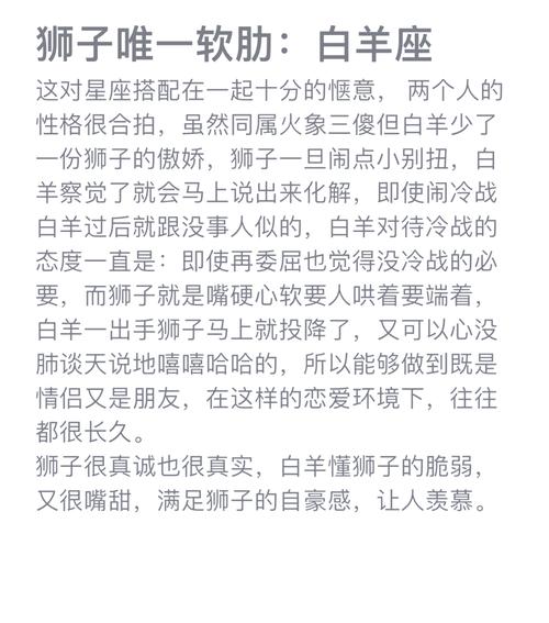 獅子座的霸氣和自信,與白羊座的熱情和沖動(dòng),在生活中碰撞出無(wú)限的火花。他們都喜歡成為人群中的焦點(diǎn),也都有著強(qiáng)烈的占有欲。當(dāng)他們陷入愛(ài)河時(shí),會(huì)毫不吝嗇地表達(dá)自己的愛(ài)意,也會(huì)盡最大努力滿足對(duì)方的任何需求。