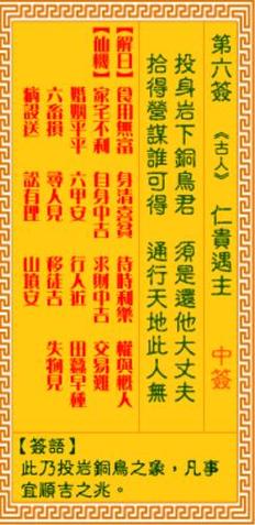 簽文內(nèi)容:第六簽的簽文是“投身巖下雕鳥居,須是還他大丈夫;及早營謀誰可得,通行天地此人無。”這描述了一個人為了大義,甘愿投身險境,最終得到應(yīng)有的回報。