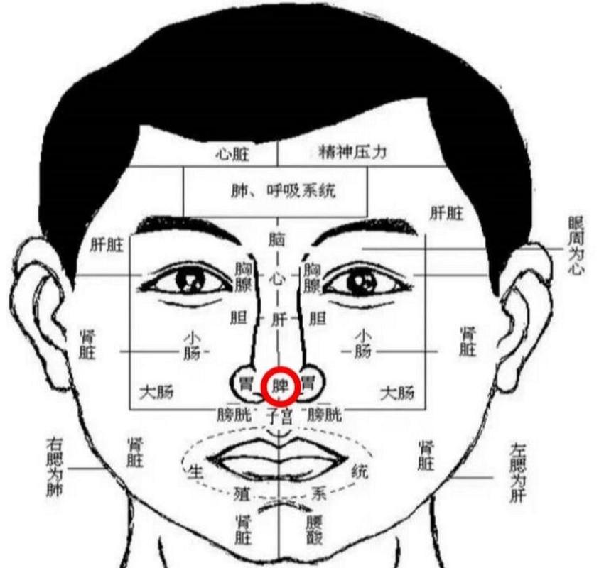 8. 下巴:位于面部最下方,關(guān)系腎功能受損或內(nèi)分泌系統(tǒng)失調(diào)。