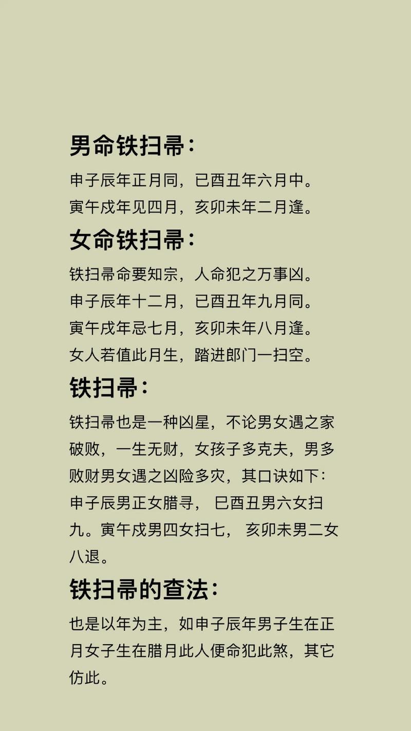 在傳統(tǒng)的八字命理學(xué)中,“鐵掃帚”是一個(gè)兇煞神,代表著災(zāi)難、破敗和霉運(yùn)。對(duì)于男命而言,如果鐵掃帚出現(xiàn)在特定的時(shí)辰,其兇險(xiǎn)程度會(huì)更大。