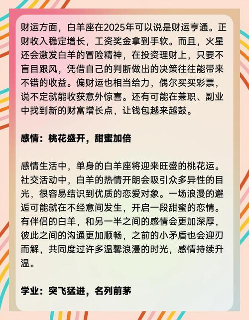 桃花運:2025年對單身的白羊座來說是一個充滿戀愛機會的年份。上半年,白羊座的桃花運非常旺盛,有機會在社交聚會或日?;顒又杏龅叫膬x的對象。下半年,雖然桃花運有所減弱,但仍然有機會遇到合適的人。