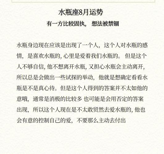5. 避免沖動(dòng):雖然8月份是水瓶座桃花運(yùn)旺盛的時(shí)期,但在追求愛(ài)情時(shí)也要保持理智,避免盲目沖動(dòng),選擇適合自己的伴侶。