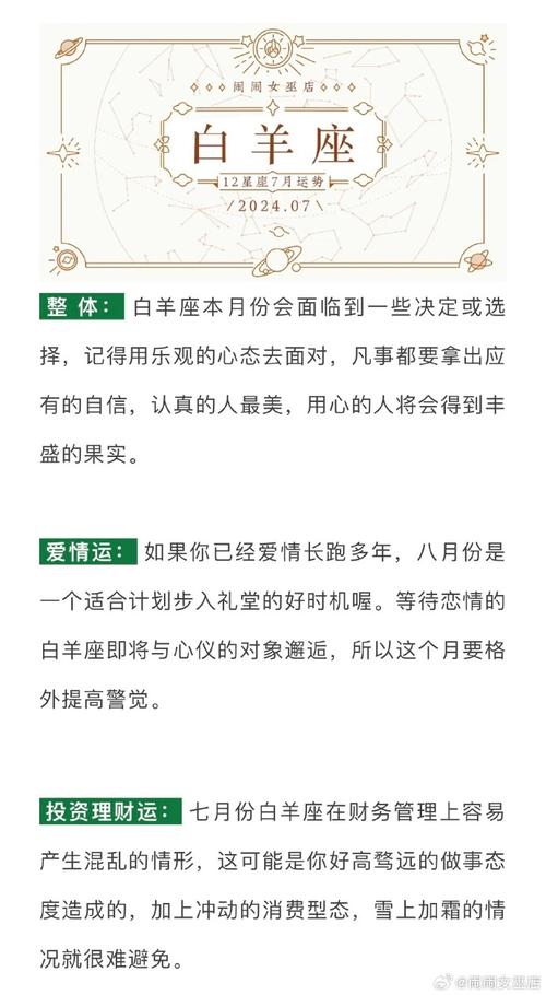 挑戰(zhàn):白羊座在7月可能會面臨一些職業(yè)上的挑戰(zhàn),需要保持冷靜和理性,避免因為一時的沖動而做出錯誤的決策。