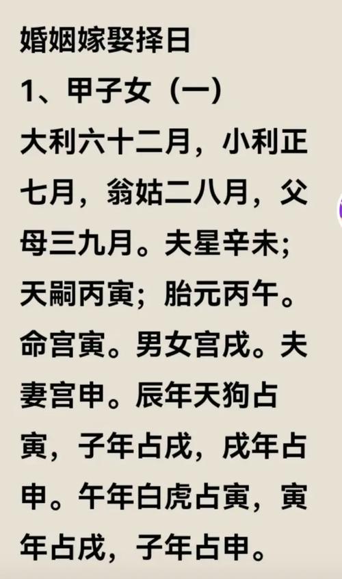2. 選擇大利月:根據(jù)傳統(tǒng),女性在特定的月份結(jié)婚被認(rèn)為更為吉利。例如,甲子女大利六月和十二月,吉利正月和七月。