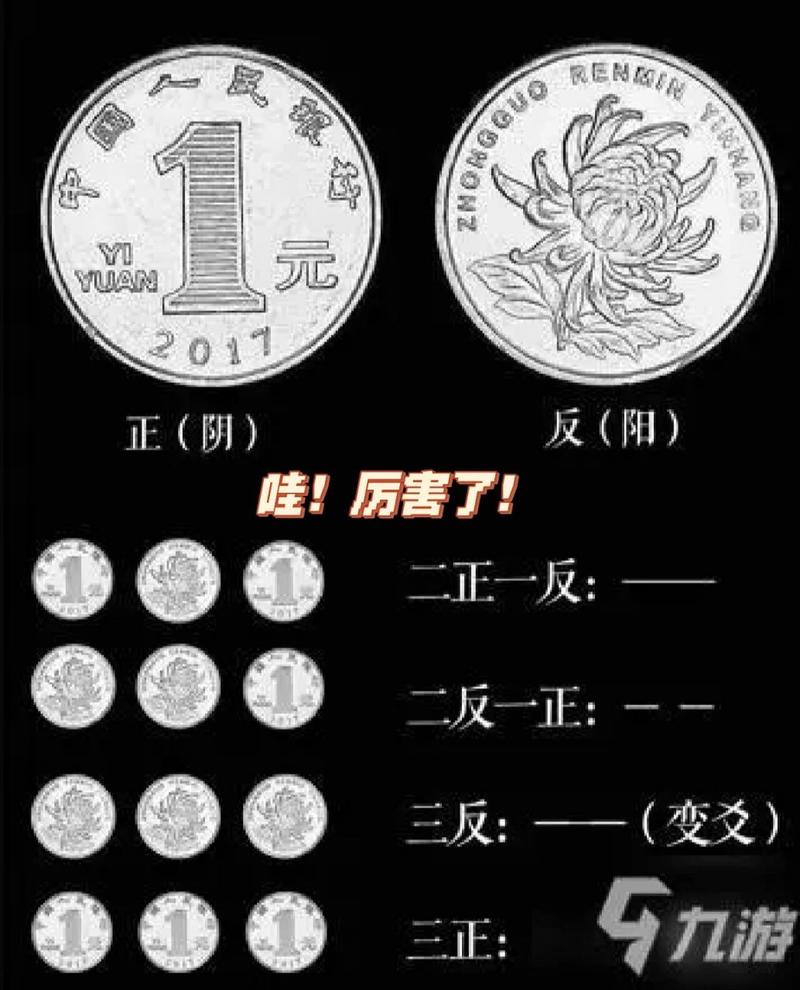 4. 結(jié)果判定:硬幣落下后,根據(jù)正反面的朝上情況來(lái)判斷結(jié)果。一般來(lái)說,正面朝上代表吉,反面朝上代表兇。