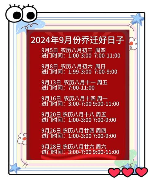 根據(jù)您的需求,以下是2024年9月8日搬家吉日的詳細(xì)信息,包括黃道吉日、宜忌事項(xiàng)和吉時(shí)等。