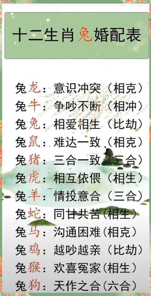 對于兔兔們來說,在婚配時除了要考慮生肖因素外,還需要考慮雙方的性格、三觀和家庭背景等因素。只有綜合考慮這些因素,才能找到真正適合自己的另一半。