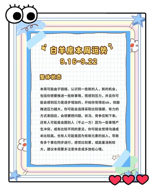 本周白羊座需要注意身體健康,避免過度疲勞和壓力過大。保持良好的作息習慣和飲食習慣,適當進行運動和休息。健康是白羊座的寶貴財富,保持健康的生活方式不僅有助于身體健康,也能提高整體運勢。