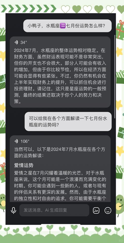 2024年7月,水瓶座在愛情方面既有甜蜜和機遇,也面臨挑戰(zhàn)和考驗。單身的水瓶座應主動出擊,把握桃花運;已有伴侶的水瓶座則需加強溝通和理解,共同面對感情中的挑戰(zhàn)。無論處于何種情感狀態(tài),保持積極和成熟的態(tài)度是關鍵。