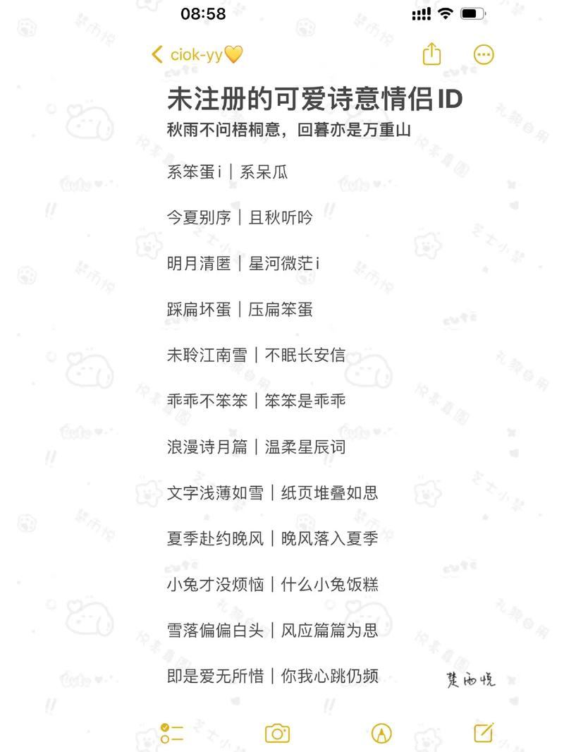 避免雷同:盡量避免與常見的煙雨情侶名字雷同,力求創(chuàng)新和個性化。