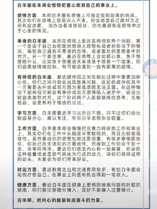 摩羯座本周在事業(yè)、愛情、財運和健康方面都有不錯的發(fā)展,但也需要注意處理好人際關系和投資風險,保持身心健康。通過積極的態(tài)度和合理的規(guī)劃,可以在本周取得更好的成就。