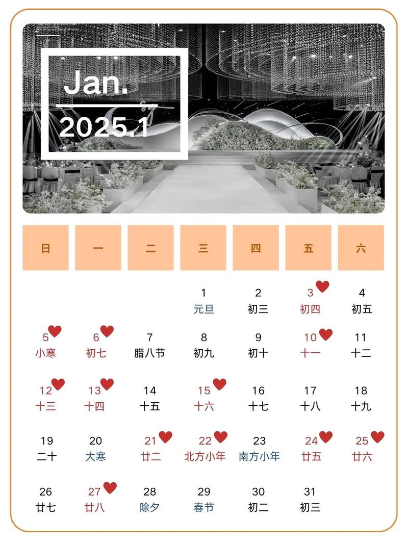 臘月廿三(2025年1月21日):宜嫁娶,且逢“三合”,象征天時地利人和。
