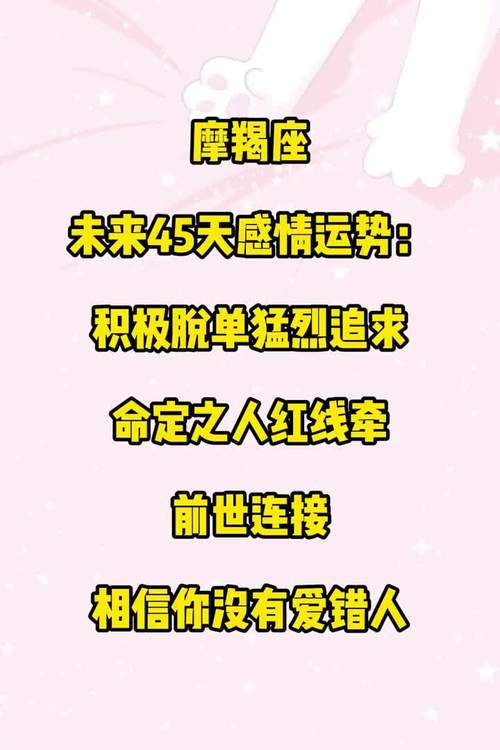 摩羯座在未來(lái)45天內(nèi)的愛(ài)情運(yùn)勢(shì)整體較為積極,但具體情況還需根據(jù)個(gè)人情況進(jìn)行分析。以下是對(duì)摩羯座未來(lái)45天愛(ài)情運(yùn)勢(shì)的詳細(xì)分析:
