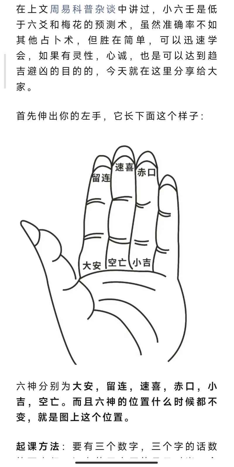 小六壬預(yù)測法:通過左手的手指節(jié),按照大安、留連、速喜、赤口、小吉、空亡的順序,結(jié)合月、日、時(shí)的信息進(jìn)行掐算。