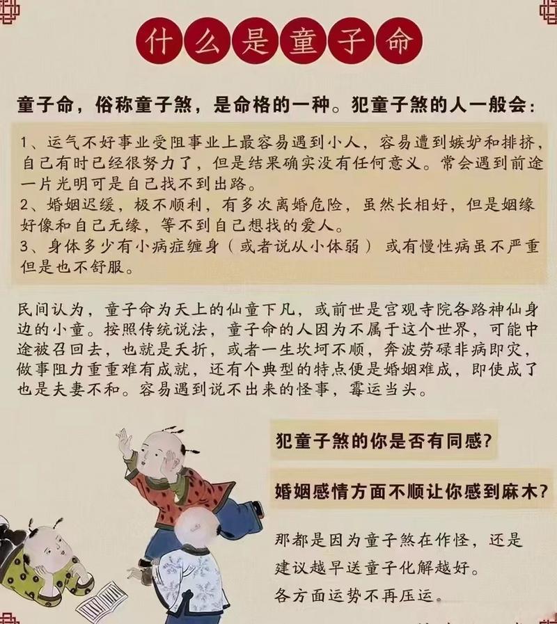 童子命,又稱童男童女命,是中國(guó)民間流傳的一種命理說(shuō)法,指人的生辰八字中帶有特定的組合,通常被認(rèn)為是一種命格特殊的人。