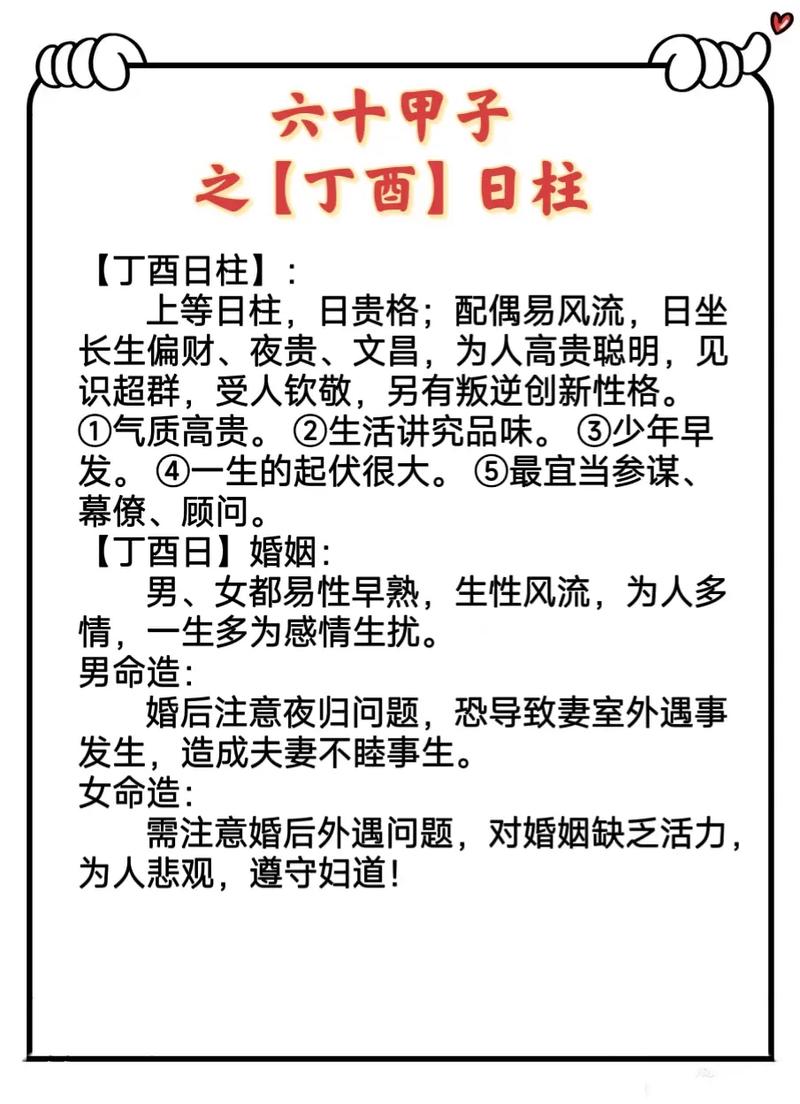 貴人相助:丁酉日柱的人通常得到天乙貴人的幫助,解災(zāi)能力強(qiáng)。