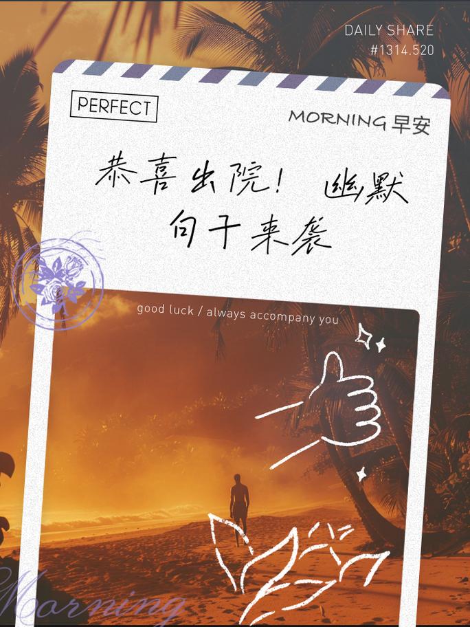 后語(yǔ):虎年甫始,山花爛漫,萬(wàn)物復(fù)蘇。告別病痛,擁抱健康,從這天開(kāi)始。愿君虎年出院,如虎添翼,志在千里。