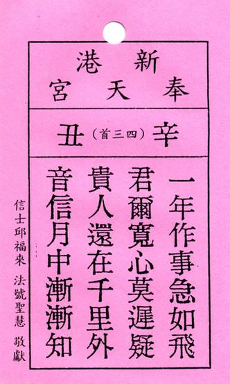 媽祖靈簽43簽,簽文為:“金雞遇夜喜相逢,寶鼎焚香拜四方,更喜貴人來合力,好音到來福祿長?!?/p>