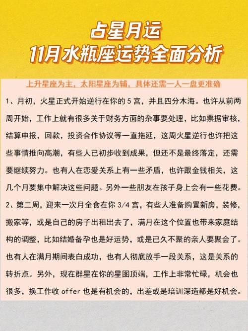 水瓶座在2024年11月的事業(yè)運(yùn)勢(shì)呈現(xiàn)出積極的變化和發(fā)展。以下是對(duì)水瓶座本周事業(yè)運(yùn)勢(shì)的詳細(xì)解析。