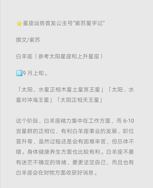 1. 白羊座的朋友們,在9月份一定要注意人際關系的維護,不要與人發(fā)生口角之爭,以免影響自己的運勢。