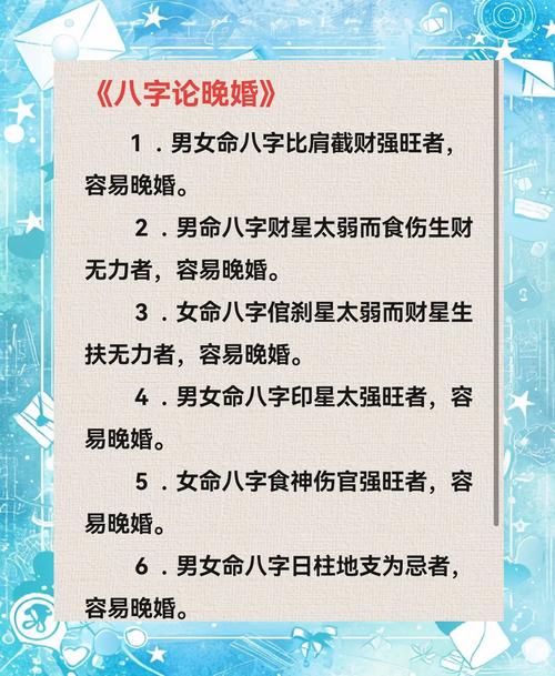 算命說適合晚婚的年齡并沒有一個固定的標(biāo)準(zhǔn),但通常男性在28歲以后,女性在26歲以后被認為是晚婚的年齡。晚婚的主要原因包括心性未定、早婚的弊端以及追求事業(yè)等?,F(xiàn)代社會的晚婚趨勢越來越普遍,個人可以根據(jù)自身情況做出更合理的選擇。
