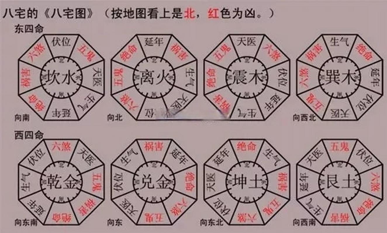 根據(jù)命卦和房屋坐向,確定家中的八個方位。每個方位對應(yīng)不同的吉兇星。例如,震宅的生氣在正東,天醫(yī)在東南,延年在正南,伏位在正北。